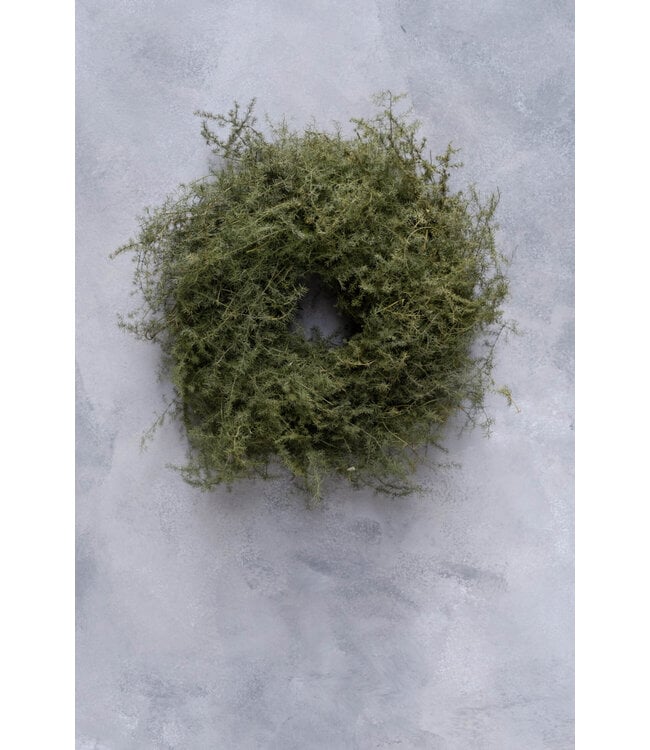 Deze elegante asparagus krans is gemaakt van fijn gedroogd materiaal en heeft een luchtige, natuurlijke uitstraling. Hang de krans aan de muur of gebruik hem als subtiele tafeldecoratie. Een tijdloze en stijlvolle toevoeging aan je woonruimte.
