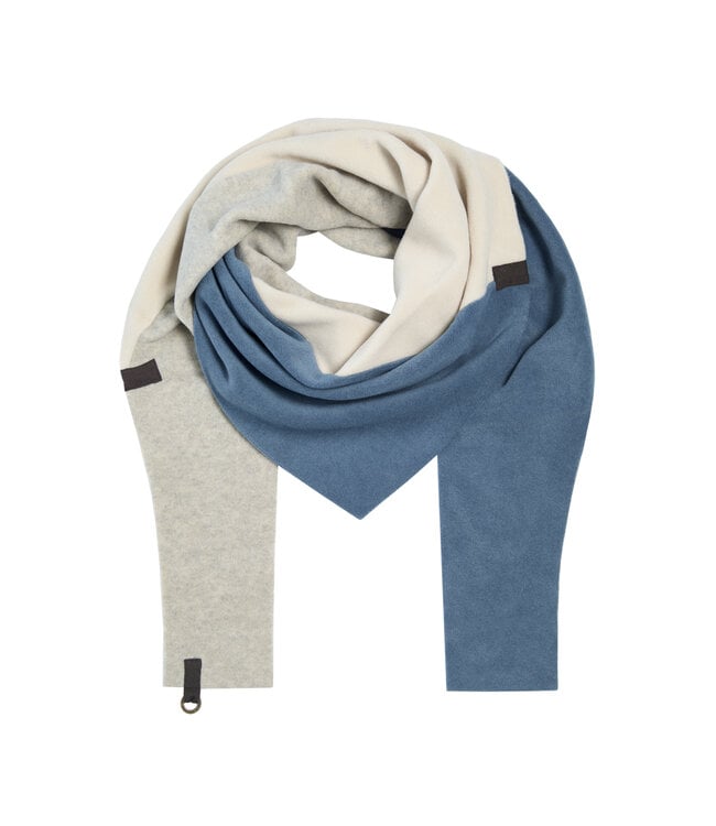 De sjaal heeft een puntmodel en is samengesteld uit de kleuren: dusty blue, kit en sand.