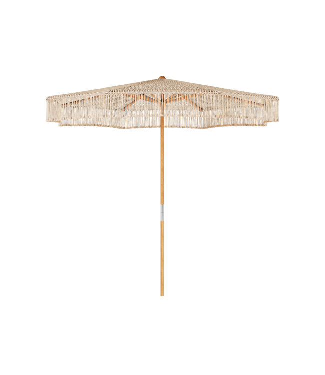 De Jardinico Macramé parasol is een exclusieve designparasol voor wie op zoek is naar sfeer, elegantie en een onderscheidende uitstraling in de tuin of op het terras. Met zijn eucalyptus frame, handgeknoopte katoenen doek en karakteristieke franjes is deze luxe parasol een echte eyecatcher. De Macramé is leverbaar in ø 250 cm en in de kleuren natural en sand. Perfect voor een stijlvolle buitenruimte met een warme, natuurlijke look.