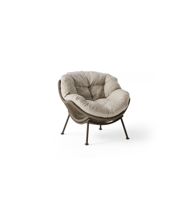 Een echte eyecatcher voor je terras: SUNS Siano loungestoel voor buiten met aluminium frame, rope details en royaal bouclé kussen met Fast Dry Foam Lees meer.